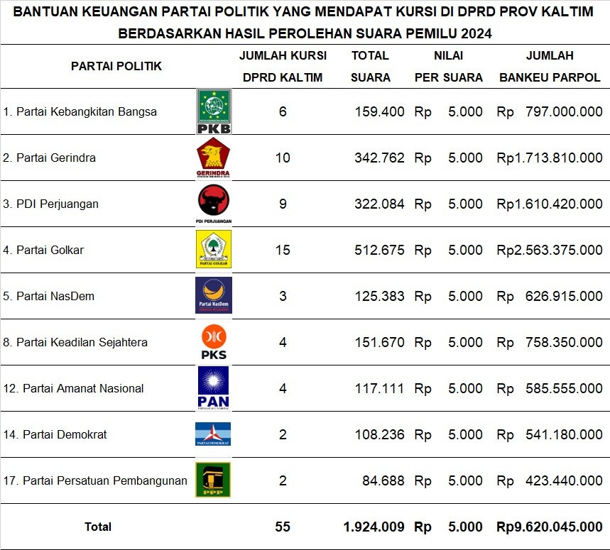 Bantuan Keuangan Partai Politik yang Mendapat Kursi Di DPRD Prov Kaltim Berdasarkan Hasil Perolehan Suara Pemili 2024 |
